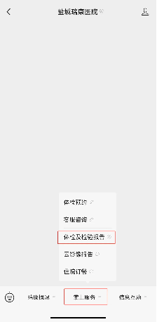 关注“盐城瑞康医院”公众号,点击菜单栏“掌上服务”-“体检及检验报告”-“检验”。
