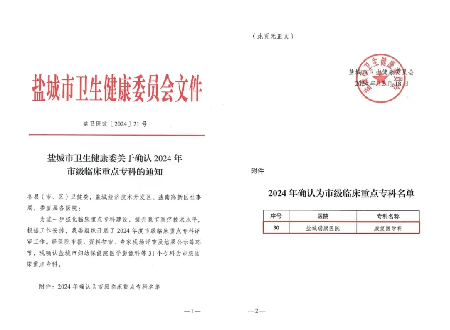 12月18日,盐城市卫生健康委员会印发了《关于确认2024年市级临床重点专科的通知》,我院康复医学科榜上有名,顺利通过验收成为2024年度盐城市级临床重点专科。